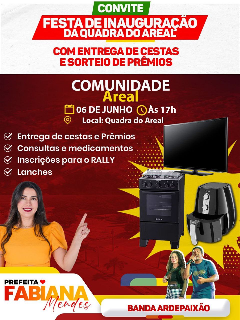 A Prefeitura de Presidente Vargas, sob a gestão da prefeita Fabiana Mendes, convida toda a população para a festa de inauguração da quadra do Areal, que será realizada no próximo dia 6 de junho, a partir das 17h.
